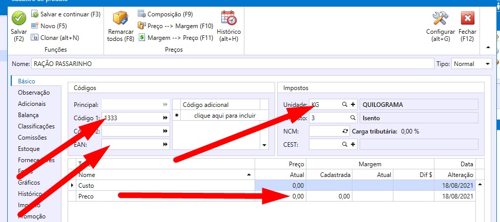 EX: Cod: 200 – Mortadela (No exemplo ao lado o nº 200 será o codigo colocado no campo codigo 1)