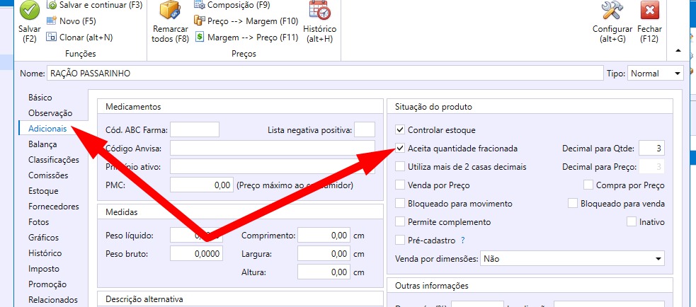 Na aba Adicionais, marque a flag (Aceita Quantidade Fracionada)