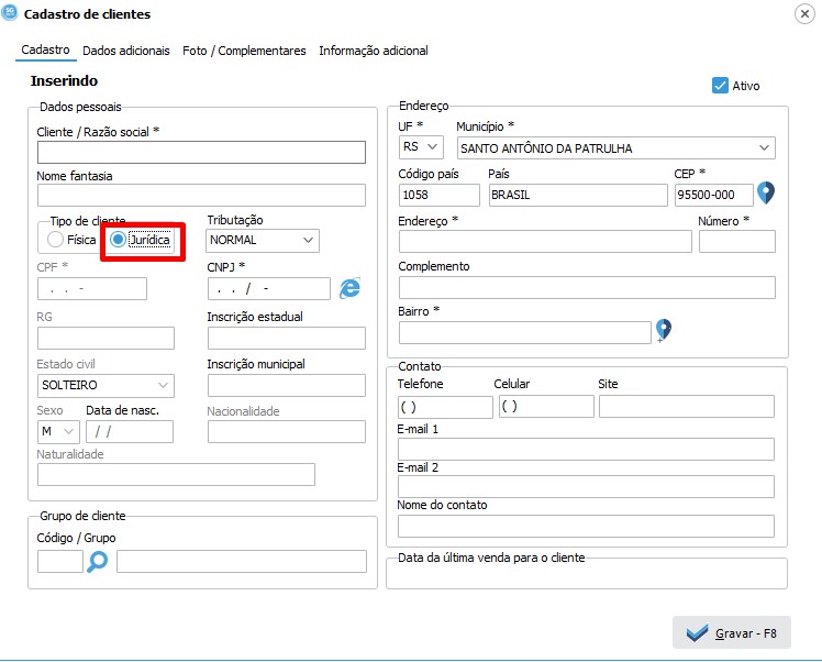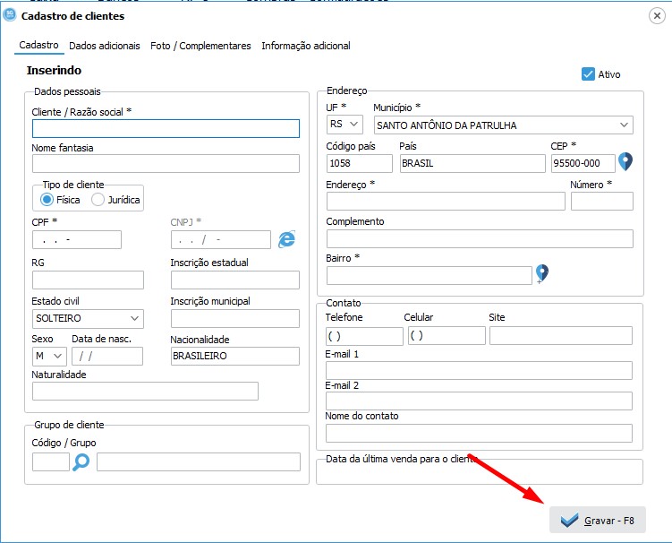 Após preencher todos os campos, clicar em “gravar”, assim o cadastro do seu cliente estará gravado e pronto com as informações preenchidas. Verifique na tela abaixo o botão em destaque.
