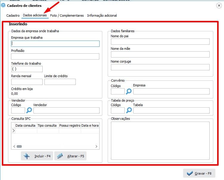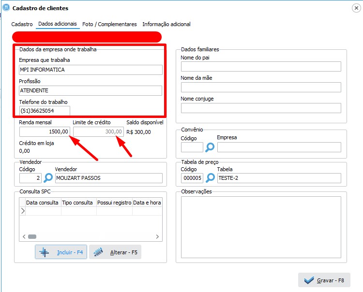 Exemplo a baixo dos dados adicionais preenchidos, no exemplo, colocamos de forma fictícia uma renda mensal para que pudesse calcular o limite de crédito para aquele cliente, lembrando que se colocado o limite de crédito quando feito uma venda e ultrapassar o limite de crédito do cliente irá automaticamente pedir a senha do supervisor, mas isso veremos mais adiante.