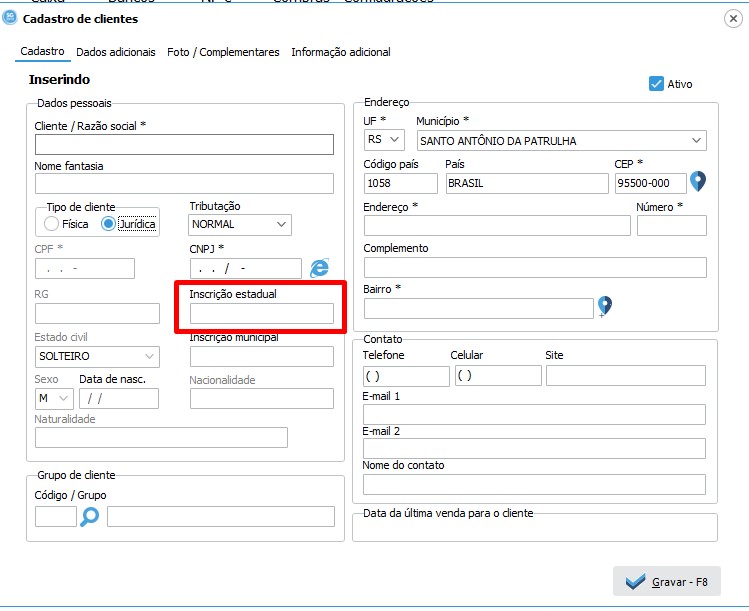 Quando o cliente for um CNPJ e utilizar a opção para pesquisar direto pelo “E” conforme mostrado a cima, não esquecer de preencher a inscrição estadual, ela não vem preenchida juntamente com os outros dados, mas é obrigatória quando o cliente tiver inscrição estadual para emitir uma DANFE. Abaixo imagem mostrando o campo a ser preenchido a inscrição estadual.