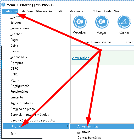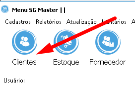Clique no menu Cadastros > Clientes ou simplesmente clique no botão principal conforme indicado pela seta chamado Clientes.