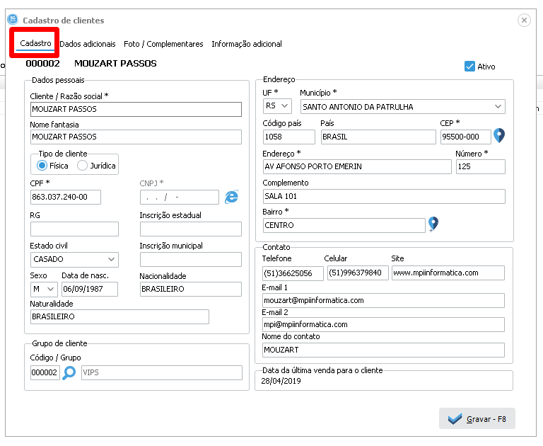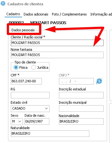 Agora abaixo observe a tela de cadastro de cliente, com a (aba) Cadastro, totalmente preenchida de forma padrão.