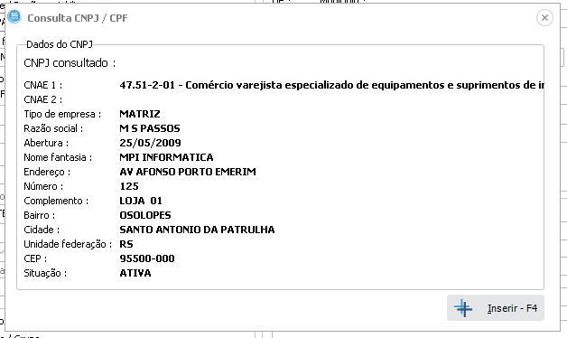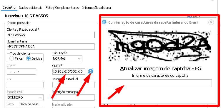 Tipo de cliente, Selecione Física e o campo CPF ficará disponível e ativo (conforme mostra na imagem acima) , selecionando Jurídica o campo CNPJ ficará ativo . Ao lado do campo CNPJ tem um ícone em azul, ao clicar nele é possível “tentar” realizar uma busca dos dados pelo CNPJ, porém como este recurso vem do site da Receita Federal, o mesmo pode retornar em erro, por isso citei a palavra tentar. Segue abaixo exemplo de uso.