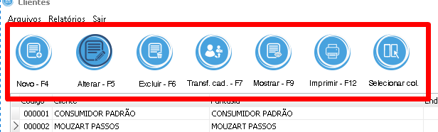Botões principais do módulo de clientes.