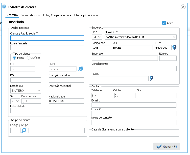 Botão: Novo – F4 , como a própria descrição já diz. Cria um novo cadastro, abrindo uma janela para inserção dos dados. Como mostra abaixo.
