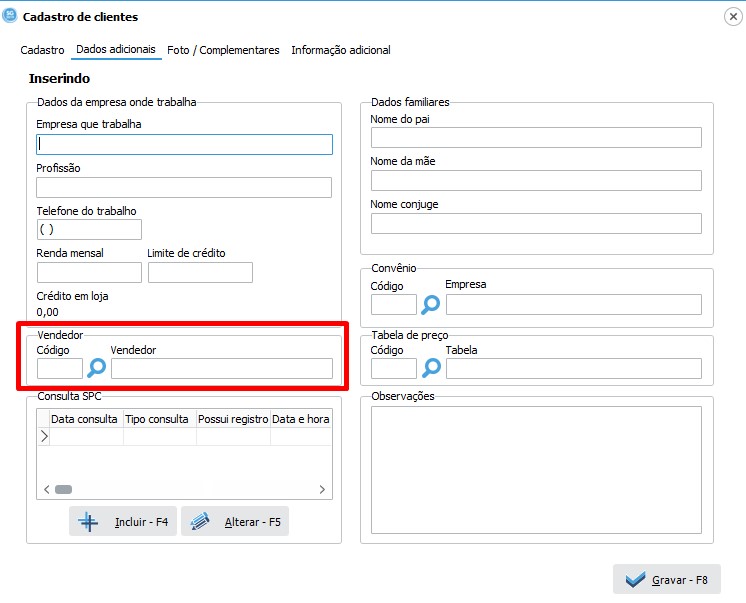 Em dados adicionais podemos verificar o campo código do vendedor, este campo pode ser preenchido para que quando o cliente chegue para ser atendido por exemplo, você abra o cadastro dele e verifique qual o vendedor que lhe atende, passando assim para o vendedor responsável pelo atendimento daquele cliente. Abaixo verificaremos o campo em destaque aonde pode ser preenchido o código do vendedor.