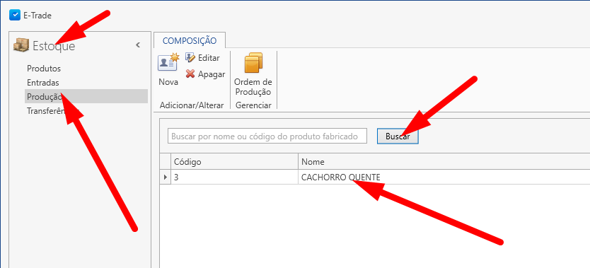 Voltando ao menu Estoque / Produção / Composição e clicando em buscar, você verá que agora possuí um produto composto / fabricado, ativo no sistema.