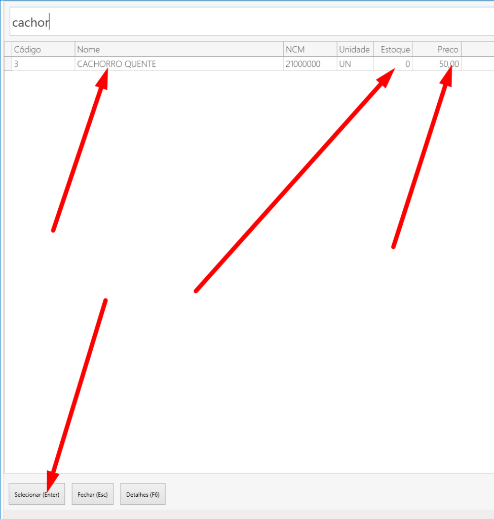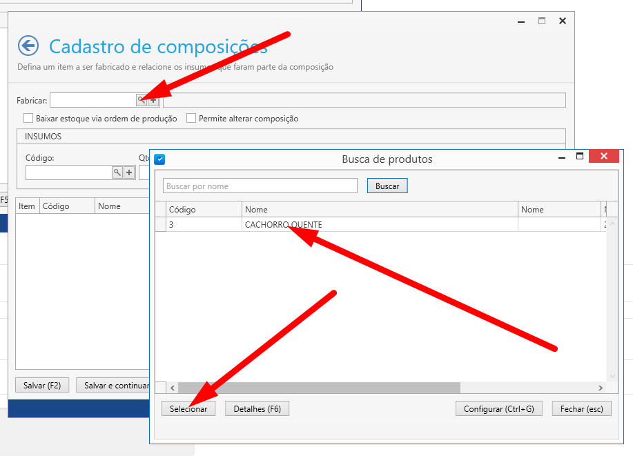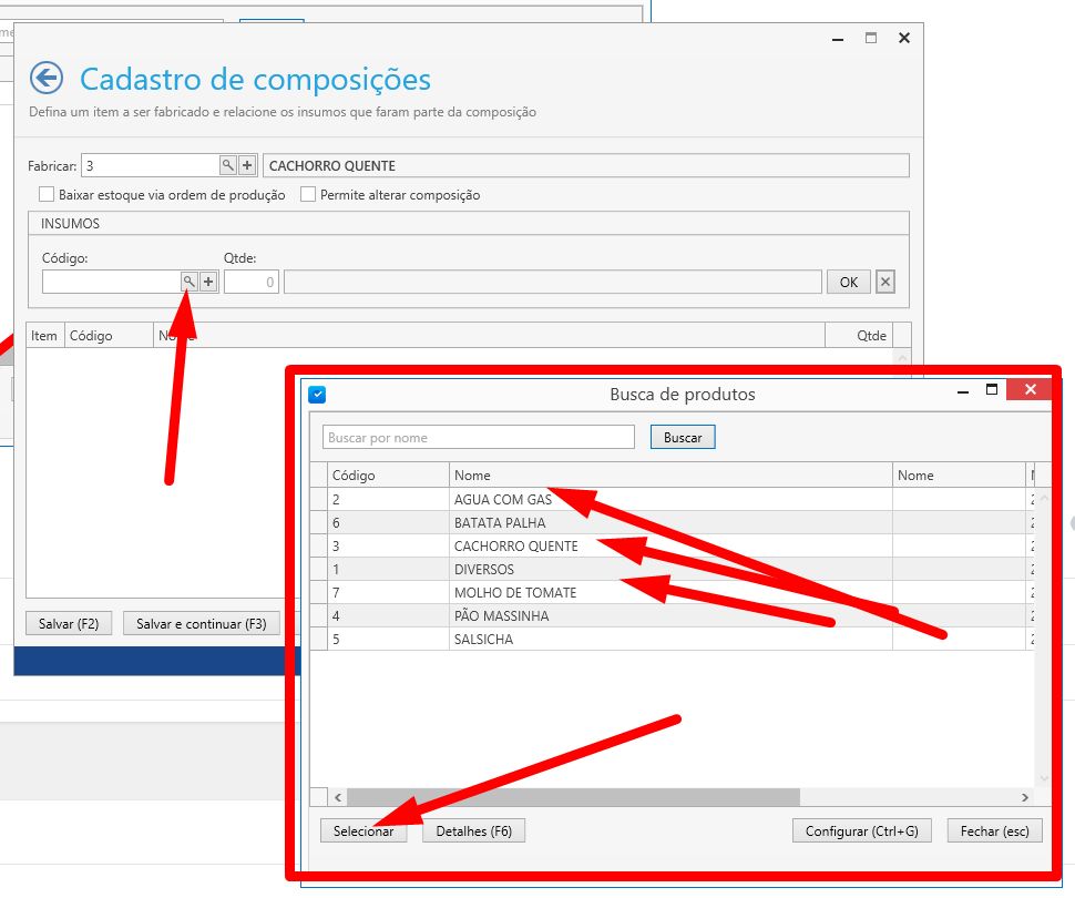 Clicaremos na lupa para procurar quais produtos no sistema estão disponíveis para serem “fabricados” conforme mostra imagem abaixo, e selecionamos o cachorro quente.