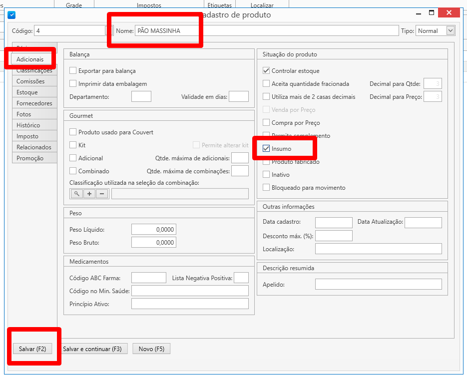 E vá até a guia (Adicionais), e marque a tag (Insumo). E salve o cadastro.