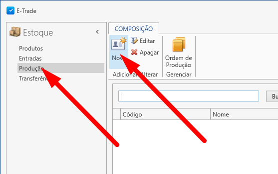 Agora iremos em Estoque / Produção conforme mostra abaixo, e clicaremos em novo.
