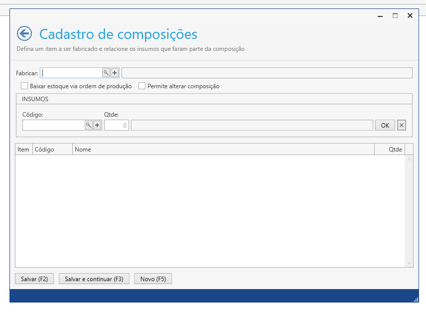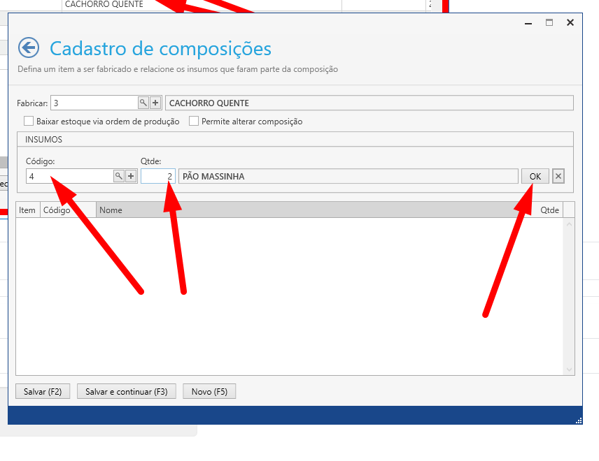 Repita essa operação com todos os ingredientes de sua composição, não se esquecendo de conferir as unidades de medida dos produtos de insumo, assim