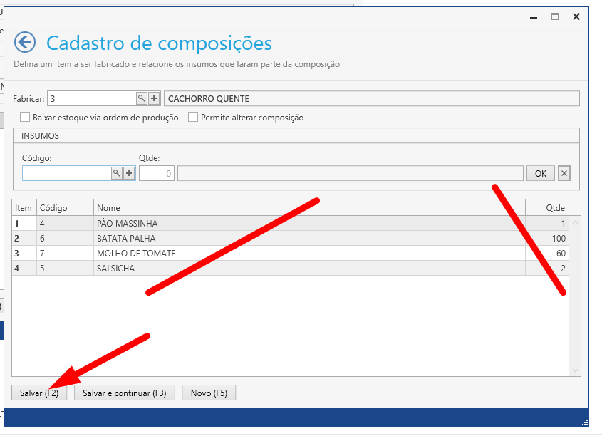 Repita essa operação para todos os insumos. Quando concluído clique em salvar.