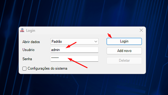 Passo 3: Após executar o arquivo, abra o sistema com o usuário “admin” senha “225588” e acesse o mesmo.