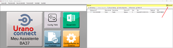 Passo 5: Após aberto o programa da “Urano Connect” está na hora de configurar para o envio automático de carga para facilitar o uso ao cliente, então você irá apertar no canto superior no botão “Expandir” e irá em “iimportar/exportação produtos +”