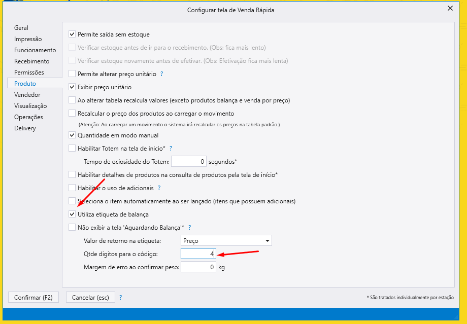 Passo 2: Marque a opção “utilizar etiqueta de balança” e coloque 4 dígitos para o código, depois seria somente salvar e testar