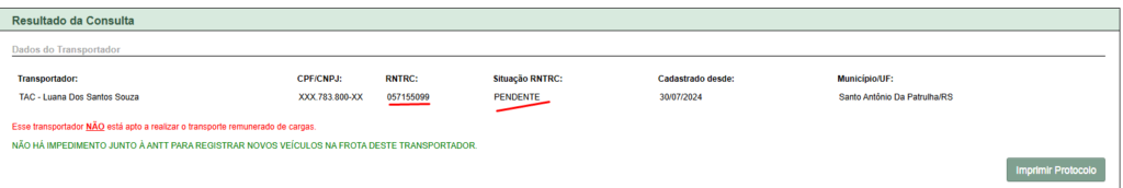 Passo 2: Sempre verifique o RNTRC e a situação do mesmo, pois caso a situação esteja como pendente ou negada, não poderá ser usado este RNTRC no sistema pois irá dar recusado. exemplo: A baixo o RNTRC da cliente no CPF dela está pendente, então tivemos que utilizar o RNTRC do CNPJ