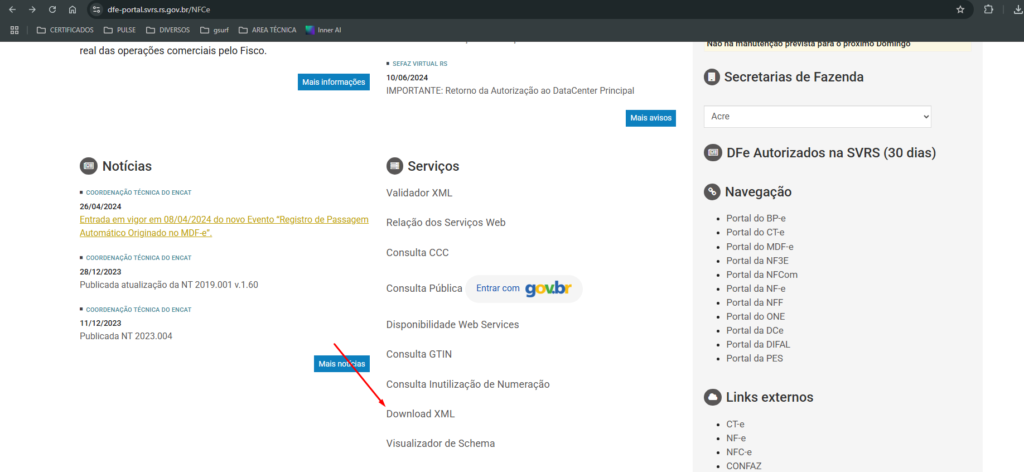 Passo 1: Acesse o site “https://dfe-portal.svrs.rs.gov.br/NFCe” e vá na aba de “download XML”, você precisará ter o certificado digital do cliente instalado na máquina