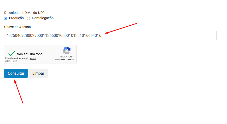 Passo 2: Feito isto, você irá colocar a chave de acesso da nota e consultar, após isto irá efetuar o download