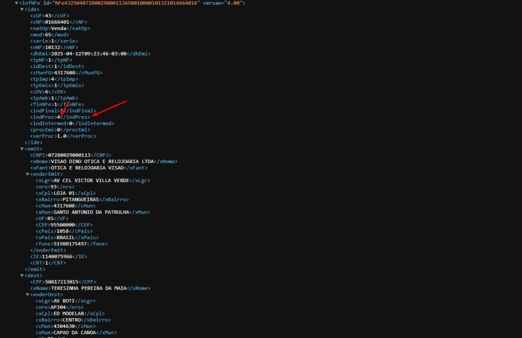 Passo 3: E para visualizar se a NFCe foi emitido com a informação de tele entrega corretamente, abra o XML e procure pelo campo “indPress” se estiver marcado “4” significa que foi feito corretamente com opção de tele entrega