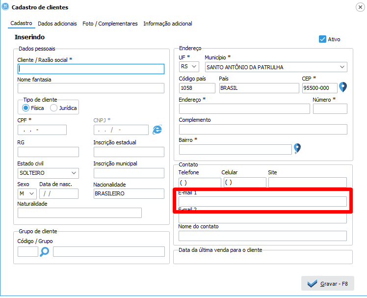 O campo e-mail dentro de cadastro de clientes não é um campo obrigatório, mas se preenchido quando emitirmos uma DANFE pra este cliente automaticamente será enviado o arquivo PDF e XML da nota por e-mail, além de envios de orçamentos entre outros relatórios de forma automática ao selecionar o cliente. A imagem abaixo mostra o campo .