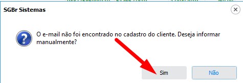 Como você não tem o e-mail do cliente cadastrado, ele vai vir a mensagem solicitando para que o e-mail seja cadastrado de forma manual, clique SIM para cadastrar o e-mail do cliente.