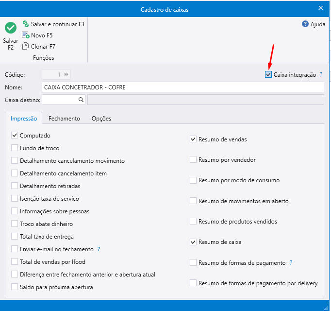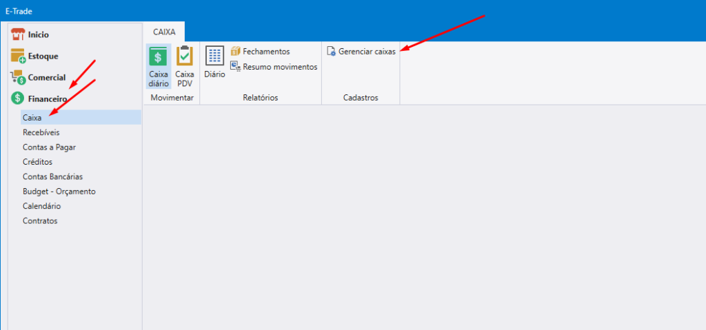 Passo 1: Vá na aba “Financeiro” < “caixa” < “gerenciar caixa” e aba os caixas para ver qual está setado a opção “caixa integração”