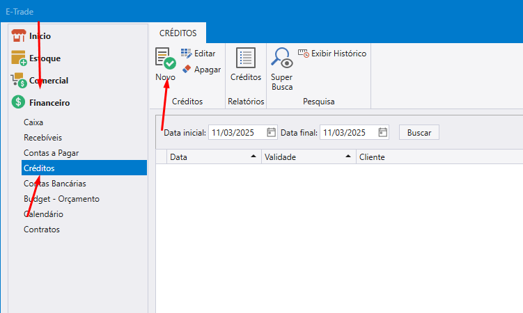 Passo 1: Entre no Etrade, vá na sessão Financeiro < Créditos < Novo Crédito.