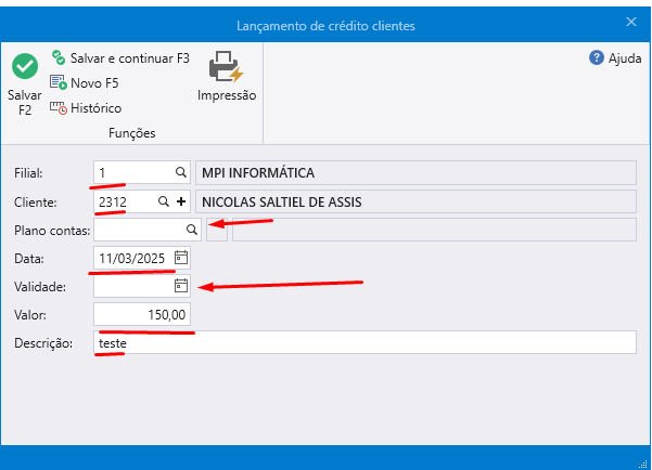 Obs: Planos de contas e data de validade são informações não obrigatórias, mas caso o cliente queira informar para ter um controle melhor do financeiro dele é possível. A data de Validade seria para caso o crédito gerado tenha um prazo, exemplo: 30 dias para usar após geração do crédito.
