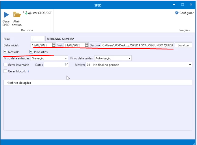 Passo 2: Selecione a data de inicio e final que a contabilidade solicitou o SPED, selecione onde você gostaria de salvar os arquivos e marque as opções “ICMS/IPI” e “PIS/COFINS”