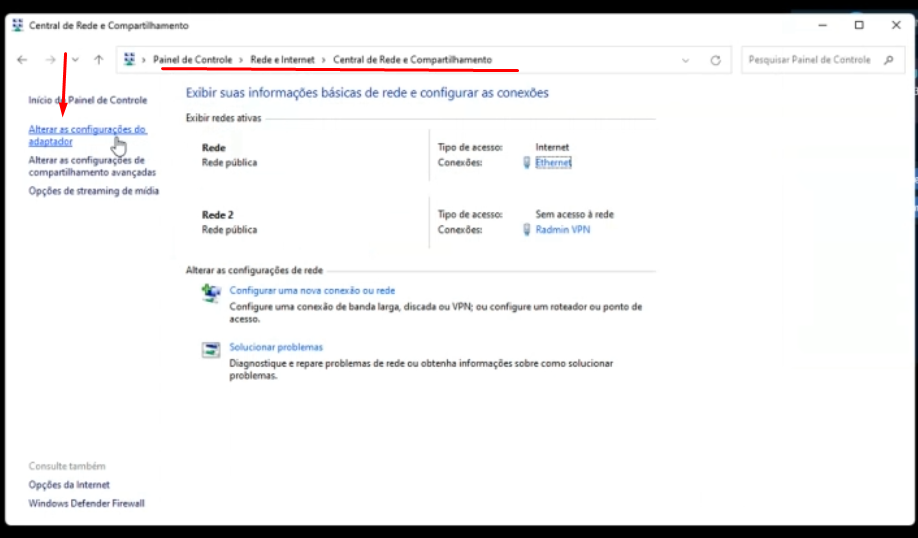 Passo 1: Vá no painel de controle e na central de rede e selecione a opção “alterar as configurações de adaptador”
