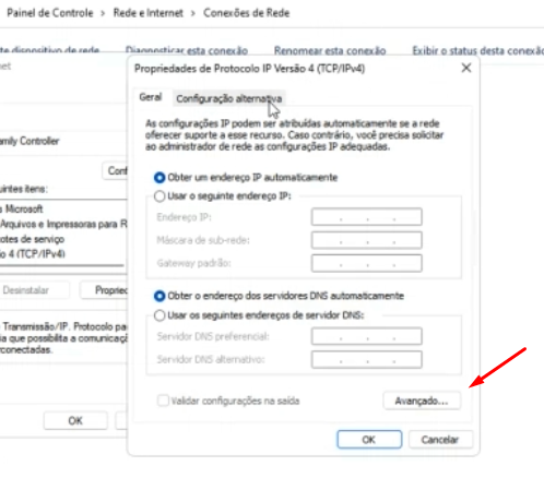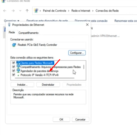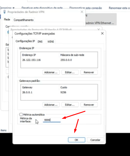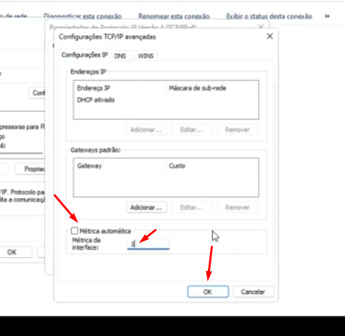 Passo 2: Vá em “realtek” e vá na aba “propriedades” e selecione a opção “protocolo IP Versão 4” e vá na aba “avançado” e desmarque a opção “métrica automática” e coloque “1” no campo