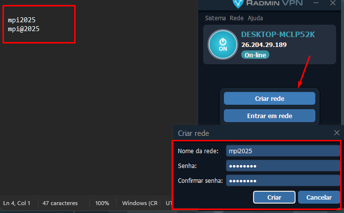 Passo 2: Após instalado e executado o programa, abra o mesmo e crie uma rede, lembrando de sempre anotar o nome e a senha da rede criado e colocar no cadastro do cliente, para casos futuros que precisa reinstalar já tenha salvo o nome.