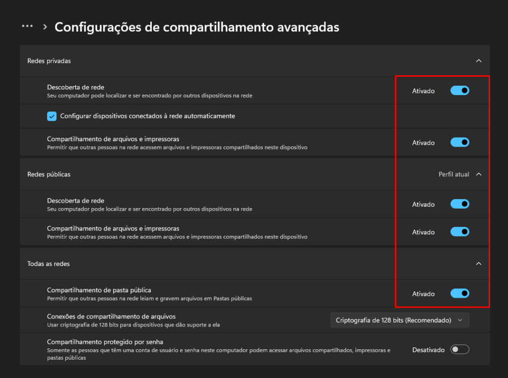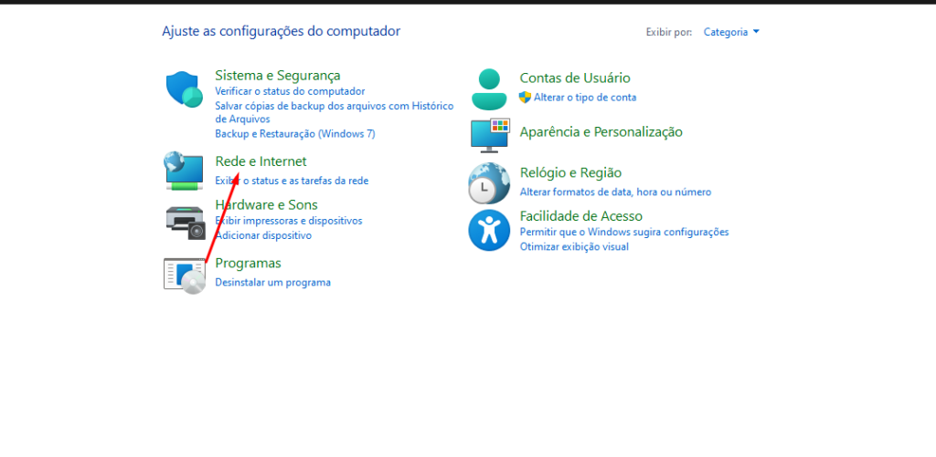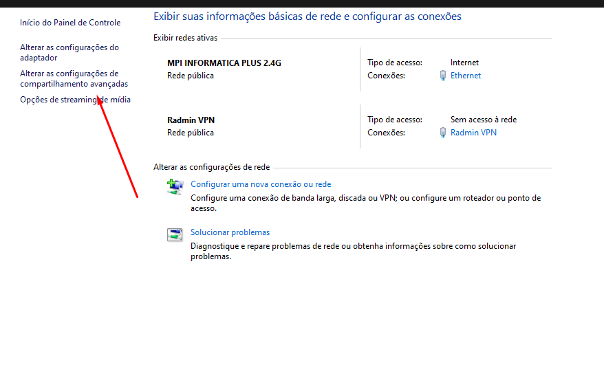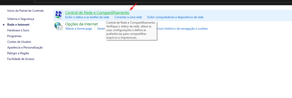 Passo 3: Feito isto, entre no painel de controle e vá nas opções de compartilhamento para ativar as mesmas.