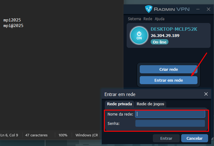 Passo 4: Feito isto, o servidor já está instalado e ok, na estação do cliente execute novamente o radmin VPN e agora em vez de criar uma rede, você irá somente acessar a mesma com os dados criado no passo 2.