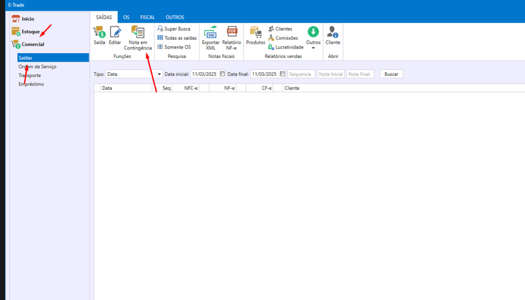 Passo 1: Abra o Etrade do cliente e vá no comercial < Saidas < Notas em contingência.