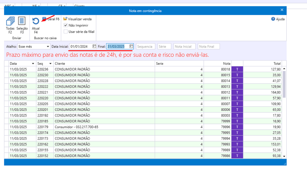 Passo 2: Arrume o filtro de data para ver uma data mais longe para ver se o cliente não tem notas mais antigas pendentes também (Sempre cuide a data, para não passar notas com prazos muito antigo caso possua) e após isto aperte em “atual” para atualizar o filtro
