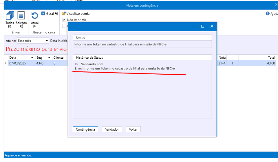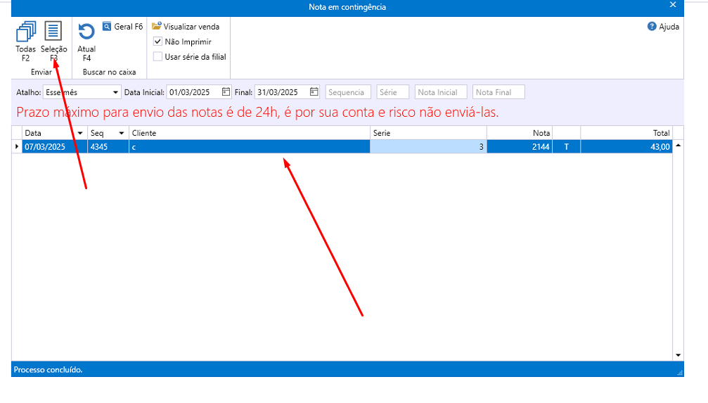 Passo 3: Após atualizado o filtro e visto as datas, sempre comece apertando em “todos” para passar o máximo de nota possível devido a erro de Internet ou comunicação no Sefaz, pois caso esteja tudo certo já irá passar automaticamente… Caso mesmo após persista uma nota ou outra, aperte em cima e aperte em “seleção f3” para pode passar somente a nota visualizada e identificar o erro
