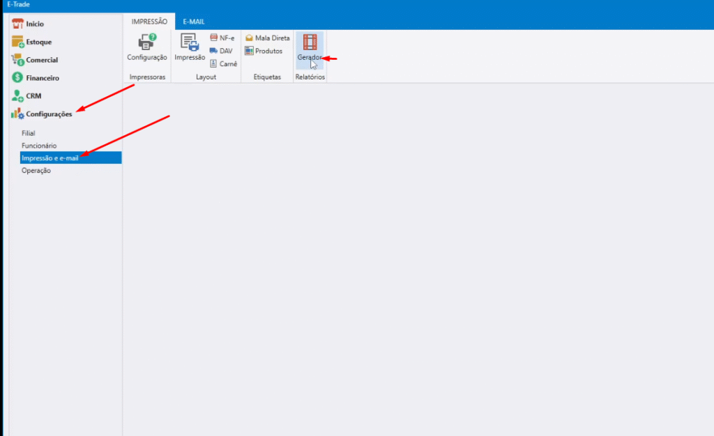 Passo 1: Abra o “Etrade” no servidor do cliente e vá em “configurações” < “impressão e e-email” < “gerador” e adicione um novo relatório