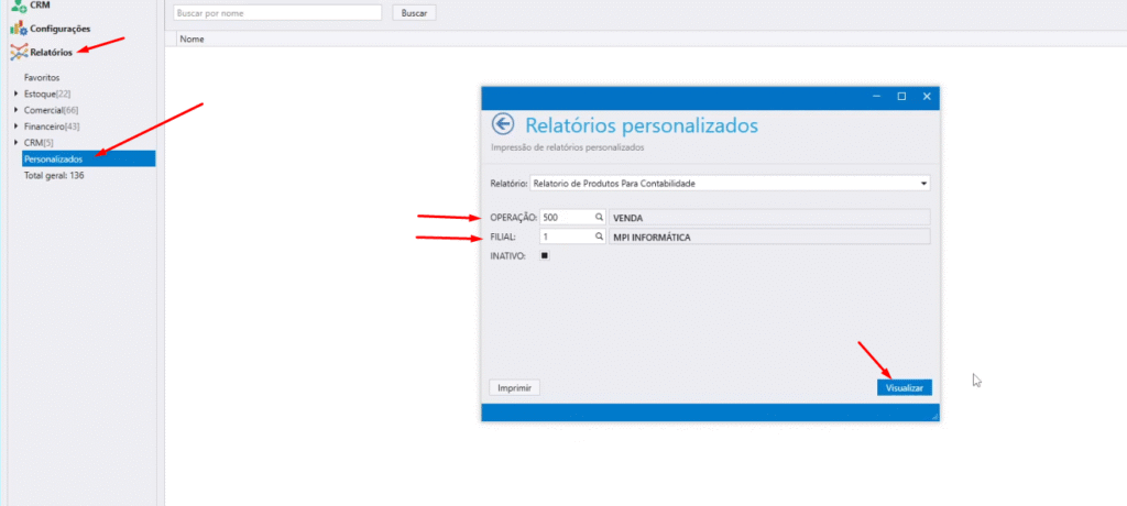 Passo 3: Vá em “relatórios” < “personalizados” e tu irá selecionar o relatório que foi colocado, selecionar a operação que quer mudar os impostos e a filial, ai seria somente apertar em “visualizar”, após isto só salvar em excel e mandar ao contador junto ao notepad com as dicas a serem seguidas.
